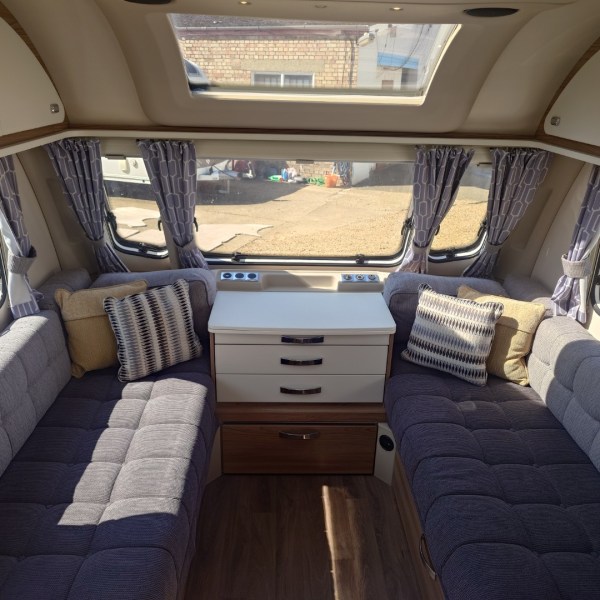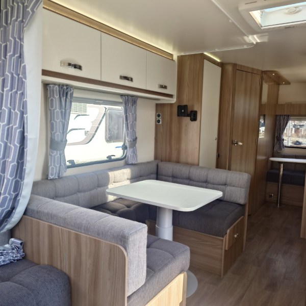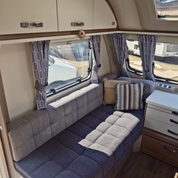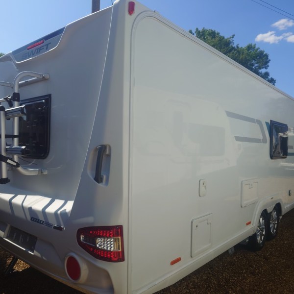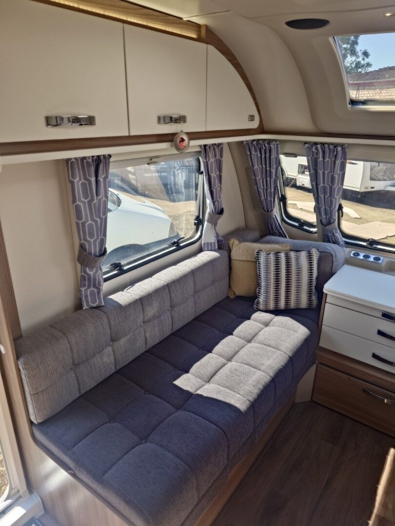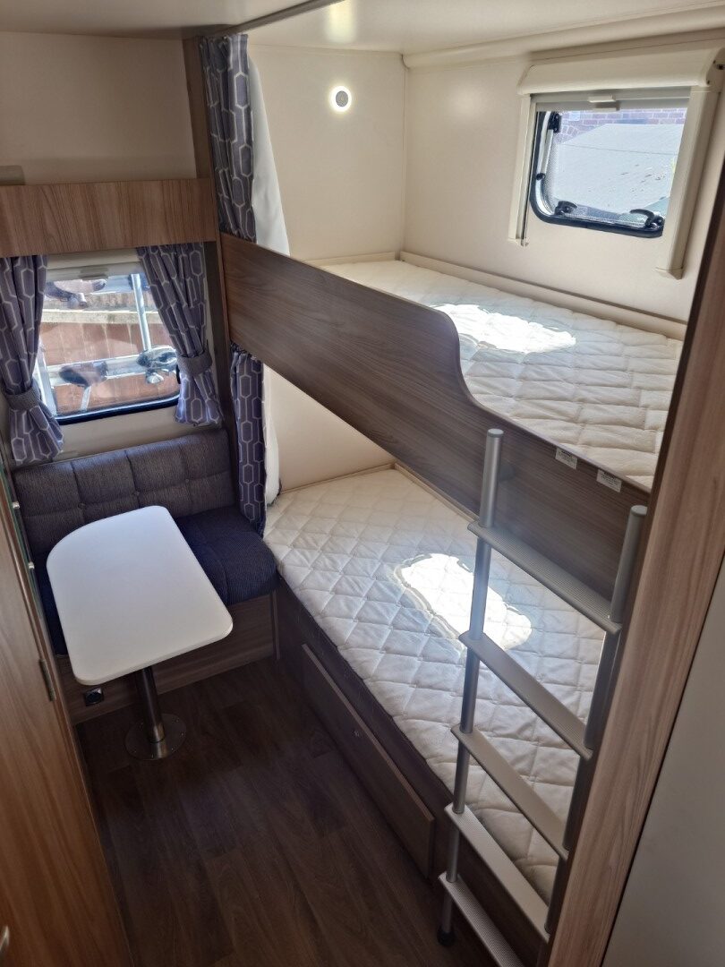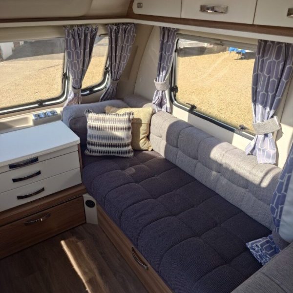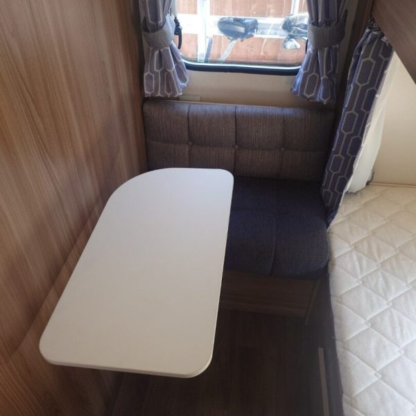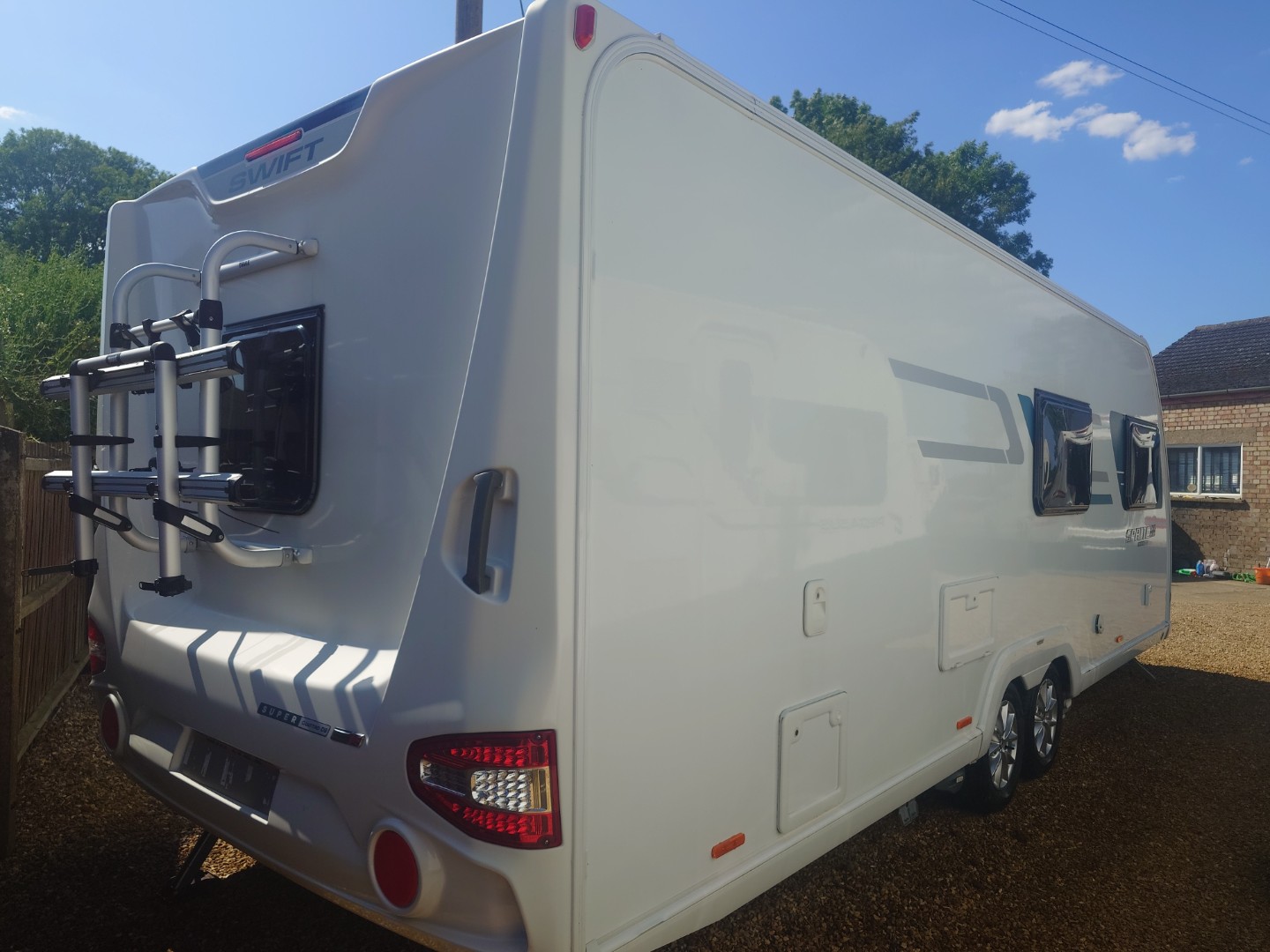 For sale we have this stunning 8ft wide 6 berth Sprite Super Quattro DB. The front seating area makes into a brilliant sized double bed and the the side u shaped dinette makes into another bed. At the rear of the caravan is a fixed bunk bed with a seat and table for the kids to use and then at the rear side is also a washroom with the toilet and shower separate as opposed to a wet room style. The interior and exterior has a real stylish design making it a excellent choice to use for all your caravan holidays be it touring or seasonally sited. Comes fitted with Powrtouch Motormovers all round making manoeuvring much easier with it being a twin axle. Thule bike rack is also fitted to the rear of the Super Quattro making bringing any bikes on holiday much simpler. Only thing we have noticed is that the pull round curtain for the side dinette has a little rip on the inside layer but nothing that affects the use of the curtain. For more information call us on 01485 601212 or come and view it for yourself! Our full stocklist can be found on our website – www.johnwickscaravans.com